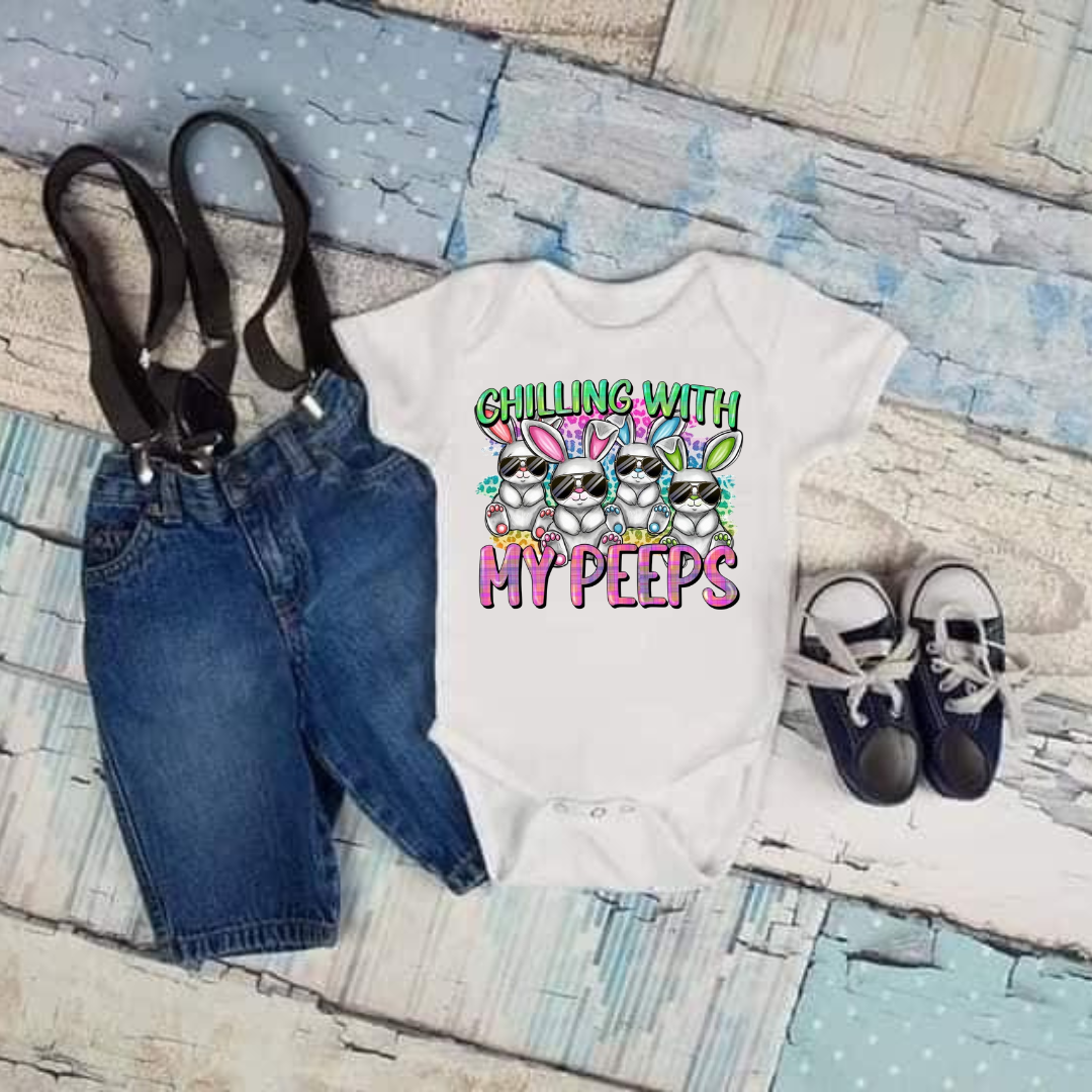 Whether you're spending a cozy day at home or venturing out for a stroll in the park, the "Chillin With My Peeps" is sure to keep your little one looking cute and feeling comfortable. Embrace the joy of parenthood and spread smiles wherever you go with this delightful and charming garment.