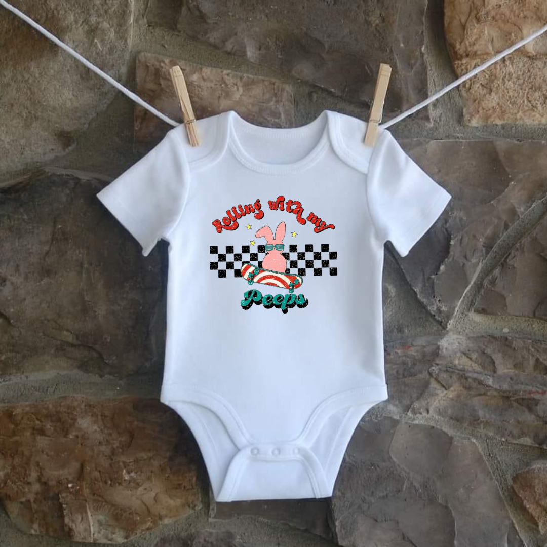 Whether you're spending a cozy day at home or venturing out for a stroll in the park, the "Rolling With My Peeps" is sure to keep your little one looking cute and feeling comfortable. Embrace the joy of parenthood and spread smiles wherever you go with this delightful and charming garment.