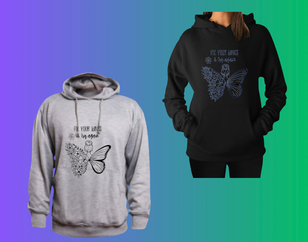 Introducing our "Fix Your Wings and Try Again" Hoodie, a symbol of resilience and determination that you can wear with pride. Crafted with both comfort and motivation in mind, this hoodie is designed to inspire and empower.